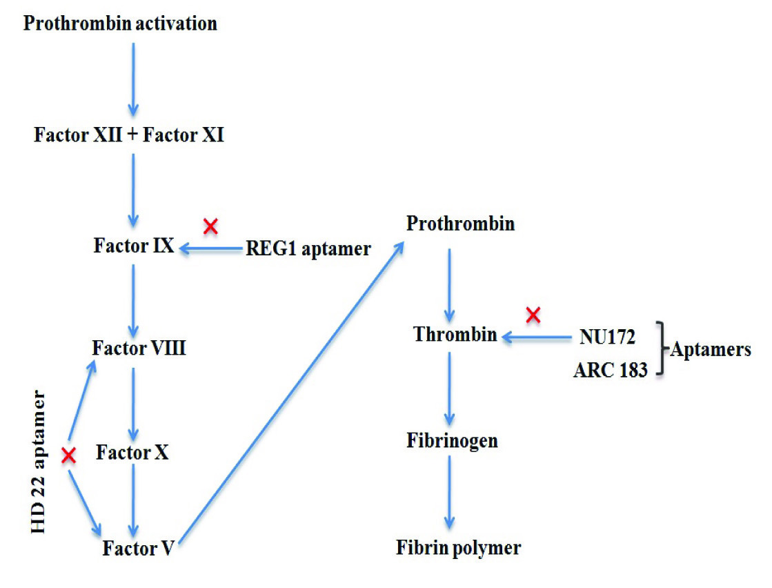 iv) ARC1779 aptamer- It targets A1 domain of von Willebrand factor and is in phase II of clinical trial (Archemix Company) [34]. Nuclease resistant RNA aptamer selected against factor XII of intrinsic pathway could also be used in preventing pathological thrombosis formation [35]. One of the advantages of using these aptamers is that not only they can be used in therapeutics, but also as sensors for diagnosis of thrombosis by tagging fluorescent molecules with them.