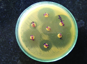Serology for Hepatitis B surface antigen (HBSAg- 7.38 IU/L) was also elevated from the normal reference range. While, serology from HIV and other hepatitis markers (HCV) were non-reactive. Widal test and IgM leptospira were also negative. Ultrasonography of the abdomen showed enlargement of the liver with features suggestive of abscess measuring 8cm×8cm×8.6cm and volume 700CC involving segment VI and VII along with mild ascites. Ultrasound guided liver aspiration was done. About 30ml of pus was aspirated and sent for microbiological investigations, for culture and sensitivity. The pus sample received was processed as per standard microbiological protocol. A wet mount of pus was negative for Trophozoites of Entamoeba histolytica. Ziehl–Nelsen was negative for acid fast bacilli. Direct Gram’s stain showed gram negative bacilli along with the pus cells [Table/Fig-1]. Haemolytic colonies of 2–3mm diameter grew on blood agar and non-lactose fermenting colonies on Mac-Conkey agar. The isolate was identified as A.lwoffii on the basis of biochemical reactions with cytochrome oxidase (negative), oxidative/fermentative glucose (negative), nitrate reduction (negative), and citrate (negative). It was confirmed by automated technique with Vitek-2 system. It was found to be susceptible for cefotaxime, amikacin, ciprofloxacin, imipenem, piperacillin-tazobactam amoxy-clavulanic acid & colistin by Kirby Bauer disc diffusion method [1] [Table/Fig-2]. Skin swab and blood sample were sterile even after 48 hours. However stool sample revealed the growth A. lwoffii with the antibiotic pattern compatible with the isolate from liver abscess. A repeat sample was asked after 48 hours which showed the growth of same organism.