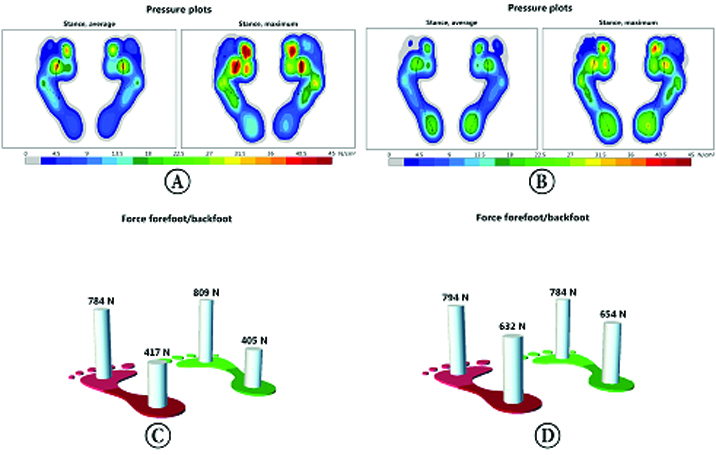 Pressure distribution before rehabilitation; A, after rehabilitation;B. Backfoot and forefoot forces before rehabilitation; C, after rehabilitation; D.