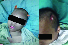 No symptoms such as pain, fever, bruising or fits was noted by the mother. Neither history of fall or trauma was noted. But the mother admitted that the girl used to roll around on the floor when she is not around even for a short duration. Clinical examination revealed a large, soft boggy swelling of 8 x 10 cm size, occupying the whole of the scalp extending into the right side of the face. No focal neurological signs or a sign of inflammation or tenderness was seen. The head never stayed still and was moving from side to side. Her physical examination and other organ system evaluation were completely normal.