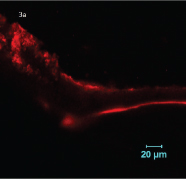 Confocal fluorescence image of control group teeth without pre-heating resin composite (37°C) showing mild micro leakage.
