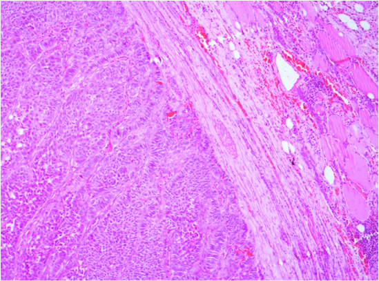 Trabacular pattern in circumscribed nodule reminiscent of neuro-endocrine differentation with invasion of vascular spaces.