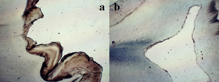 The patient was treated by removing the mass surgically and placing bone graft into the cavity for providing support during future prosthetic rehabilitation. Routine preoperative investigations and medications including antibiotic coverage and corticosteroids were prescribed. After proper surgical preparation and administration of local anesthesia, crevicular incision was made in relation to labial aspect of bony mass, followed by two diagonal relieving incisions placed on distal side of left lateral incisor and mesial side of premolar to facilitate proper access to the site. Full thickness muco-periosteal flap was elevated towards the lateral aspect of maxilla [Table/Fig-3]. Lesion was surgically enucleated from the healthy bone in toto [Table/Fig-4] and sent for histopathological examination. The diagnosis of complex composite odontoma was confirmed with identification of eosinophilic ghost cell clusters. There were seen irregular masses of enamel, dentin and pulp that bore no resemblance to normal tooth, but in some areas organized dental tissues resembling a tooth were also seen interspersed [Table/Fig-5a,b]. Hydroxyapatite (Perioglass) was used as an alloplast material for cavity bone regeneration. Absorbable gelatine sponge was placed for better haemostasis and healing and the flap repositioned. Routine post-operative instructions were given. After seven days of recall, post operative wound healed uneventfully and a panoramic radiograph was repeated [Table/Fig-6].