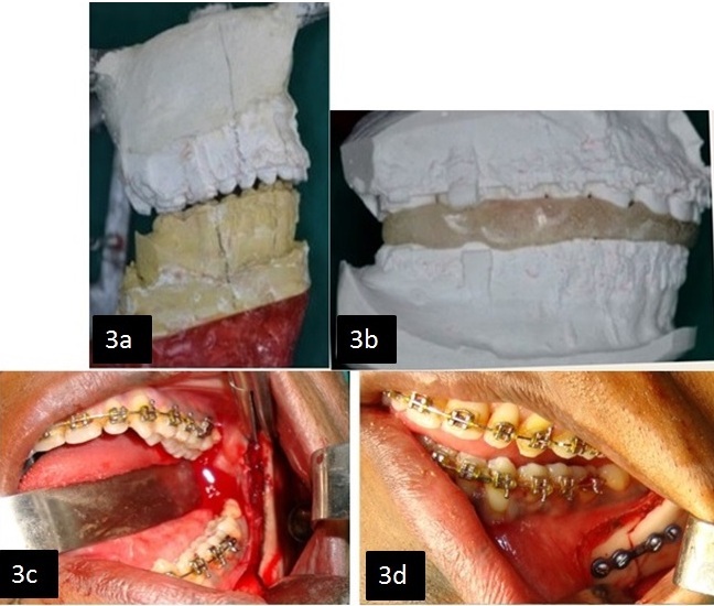 Cephalometric prediction and mock surgery: Cast prediction or model surgery and fabrication of occlusal splints for use at surgery were planned. The lower dental cast was repositioned simulating the movement of the jaws for which the guide was manual prediction. [Table/Fig-3a,3b].