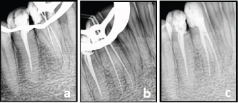 The canals were instrumented using stainless steel K- files (Dentsply Maillefer, Ballaigues, Switzerland) with master apical filing upto #35 K-file. A 5.2% solution of sodium hypochlorite and 17% EDTA were used alternatively as irrigants, at each change of file. Final irrigation was done using 2% chlorhexidine [Table/Fig-2b]. The canals were dried with absorbent paper points (Dentsply, DeTrey, Konstanz, Germany). The instrumented root canals were obturated using 2% gutta percha cones and AH Plus sealer (Dentsply, DeTrey, Konstanz, Germany) using lateral condensation technique. The final radiograph showed two well-obturated canals. After completion of root canal treatment, the tooth was restored using resin composite (3M ESPE, A G Seefeld, Germany) [Table/Fig-2c].