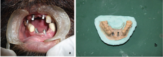 (a) Intra oral image showing implant abutments. (b) CAD-CAM milled custom made abutments.