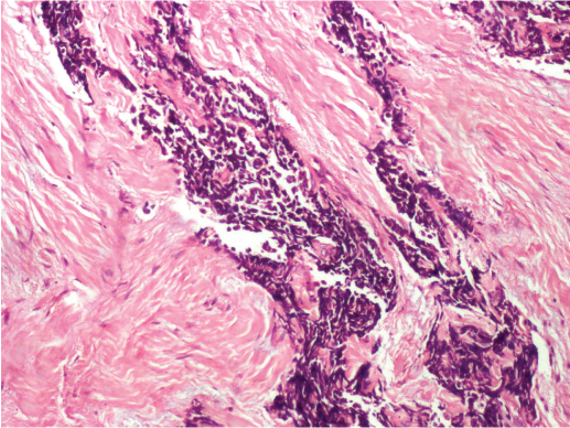 Tumour invading the fibrocollagenous tissue with features of poorly differentiated malignancy (H&E; 10X).