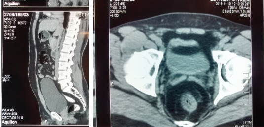 Colonoscopy was done which showed lesion in the posterior and lateral wall measuring about 4cm and 2cm from anal verge. Rest of the colon appeared normal. CECT abdomen showed circumferential irregular wall thickening about 4cm proximal to anal verge with enlarged left inguinal, mesorectal and left internal iliac lymph node enlargement without perianal fat stranding [Table/Fig-6a,b]. Chest X Ray showed no evidence pulmonary carcinoma. Bone scan was normal and tumour marker i.e., Carcinoembryonic antigen was not elevated. The patient was negative for HIV, HbsAg and HCV.