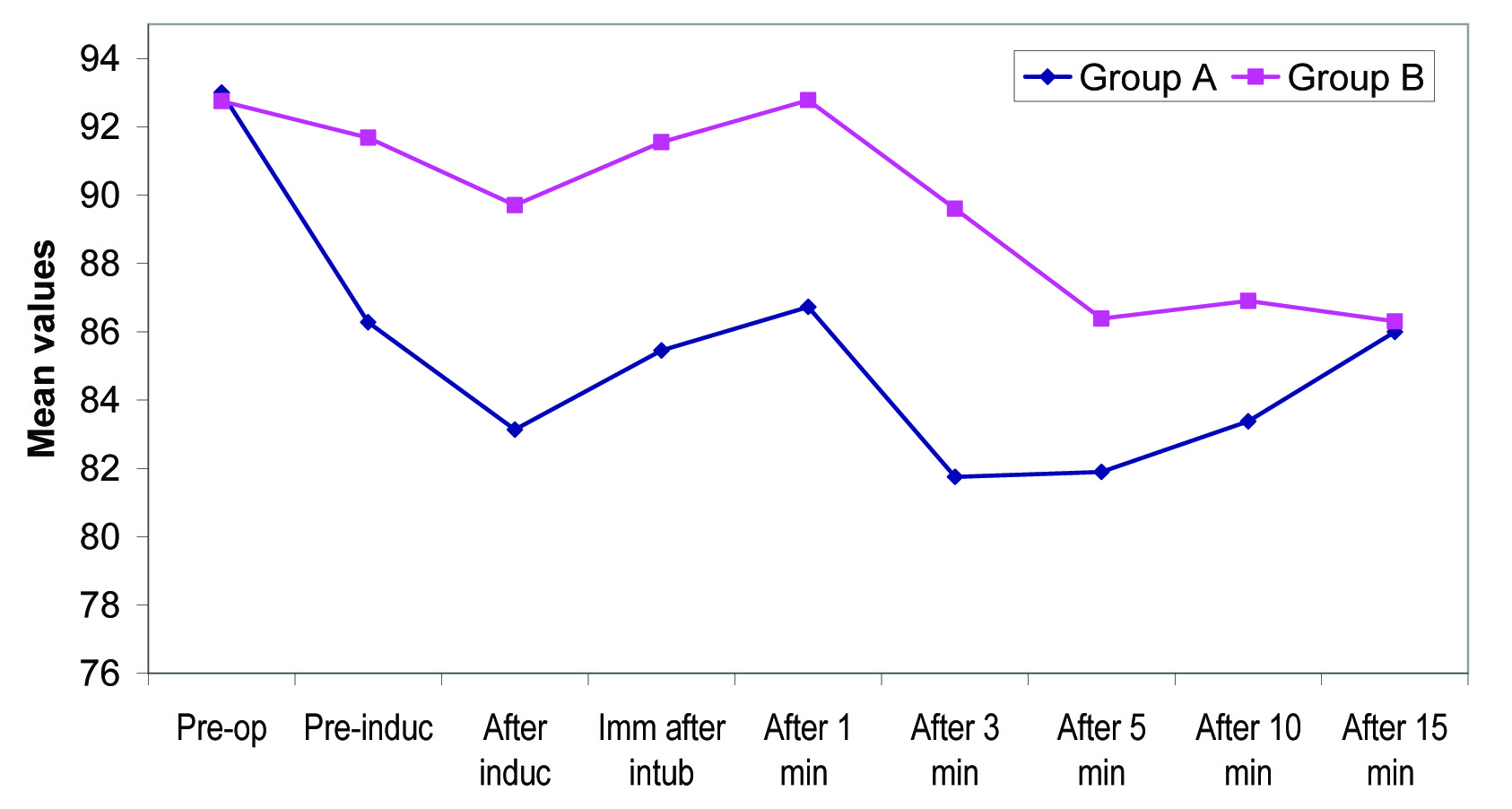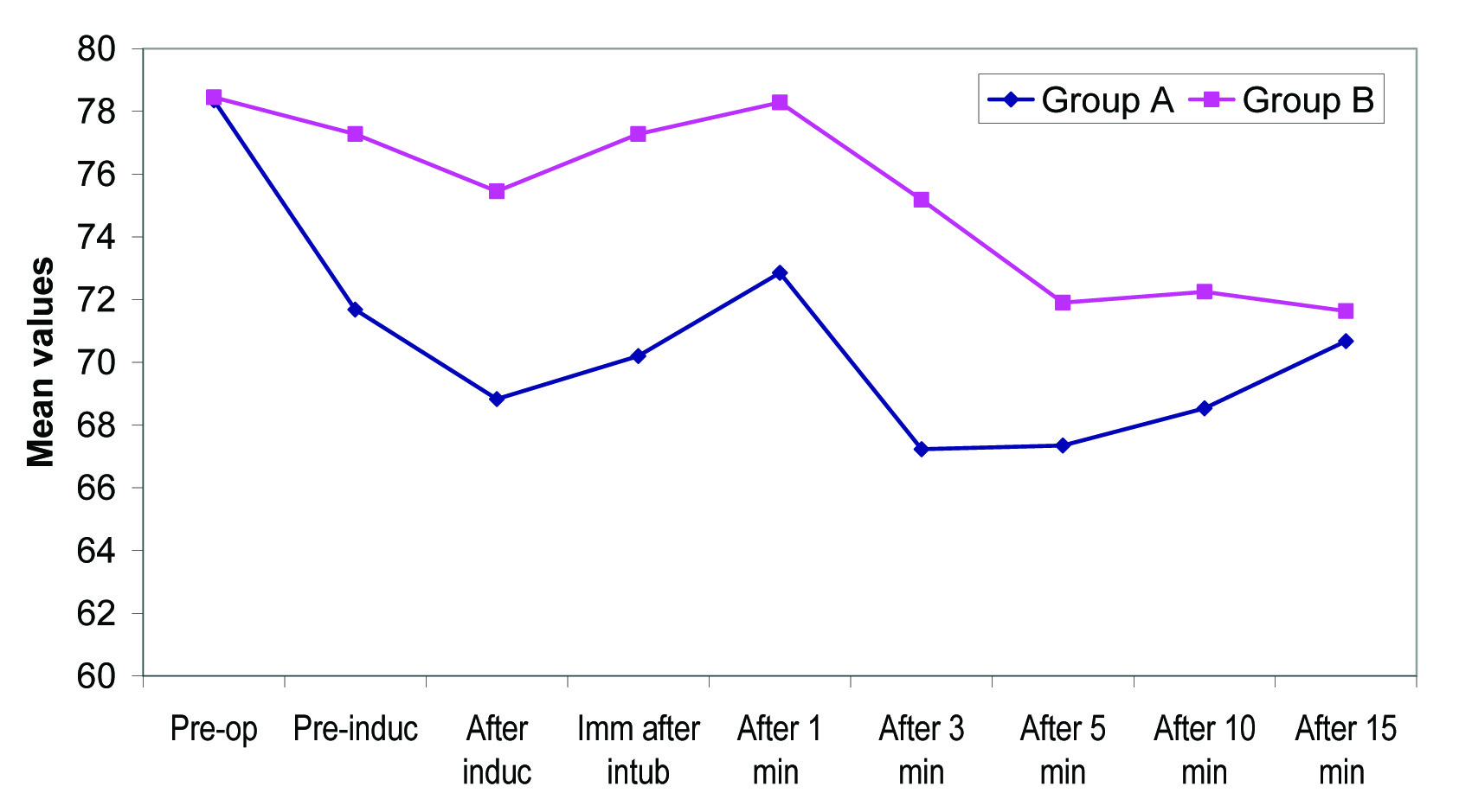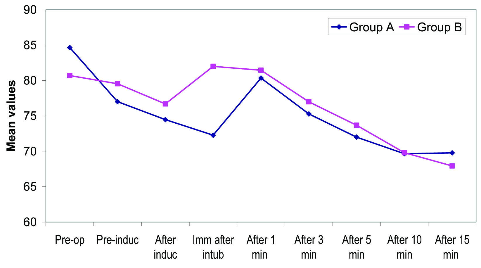 I.V. fentanyl 1 μg/kg was given. Pre-oxygenation was done for 3 minutes, then induction was done with i.v propofol 2 mg/kg followed by administration of i.v.vecuronium 0.1mg/kg to facilitate tracheal intubation. From the time of administration of propofol ventilation was controlled manually by Bain’s circuit using 100% oxygen. Blood pressure (systolic, diastolic and mean) and heart rate were recorded after giving i.v. drugs prior to laryngoscopy. Laryngoscopy and tracheal intubation was performed by an experienced anaesthesiologist and accomplished within 20 seconds with appropriate sized, cuffed endotracheal tube, 3 minutes after giving vecuronium. In case of unexpected difficult intubation the patient was excluded from the study.