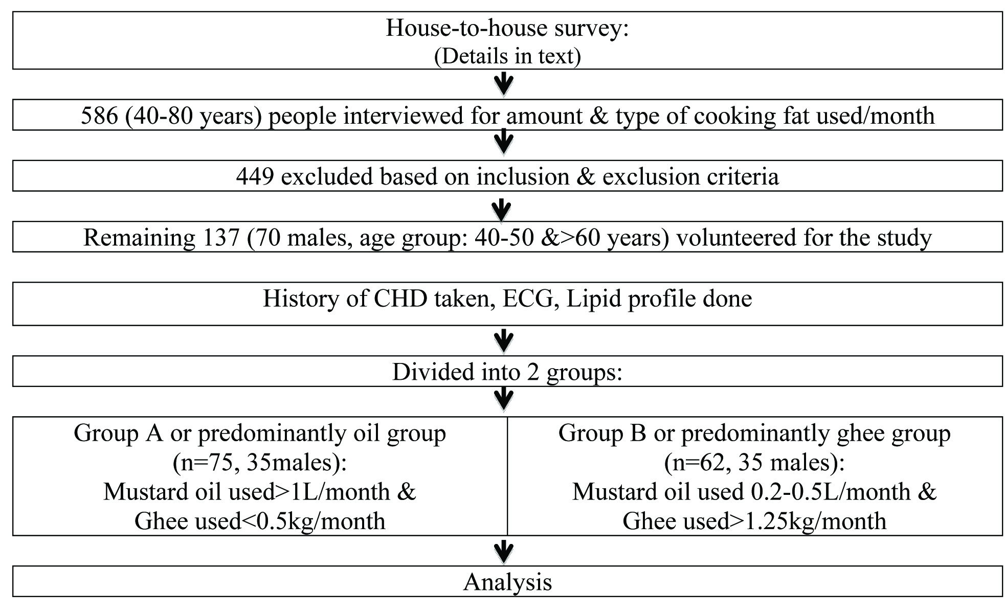 Our study was a preliminary survey to find out the association of CHD with relative amount of mustard oil and ghee consumption. Study was having several limitations. Firstly, the major limitation of our study was very small number of sample size. Further studies, preferably well designed, blinded, randomized, controlled, prospective studies, are required on a sufficiently large sample size, from different strata of society and different region of India, for the evaluation of effect of mustard oil or ghee consumption on CHD. Secondly, it was just a survey, and not an experimental or interventional controlled prospective cohort study. Thirdly, to ascertain the fat intake we relied on the words of the subject, which could result in recall and other type of bias.