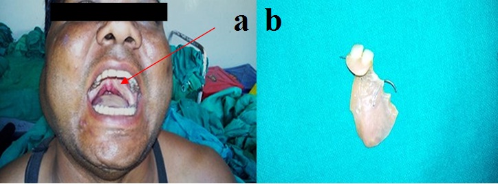 A 34-year-old male patient with old repaired facio-maxillary injury following road traffic accident, presented with vertical slit like opening in posterior hard palate on right side [Table/Fig-1]. He had complaints of regurgitation of food material from nose while eating and nasal twang while speaking. He used palatal obturator with dental retainers [Table/Fig-2a,b] to prevent regurgitation and hyper nasality but some symptoms still persisted. He needed surgical correction as the obturator couldn’t seal the fistula properly. Hence, he was planned for flap closure of the fistula by the plastic surgeon.