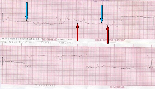 Electrocardiogram showing sinus bradycardia (heart rate - 38/min) with narrow QRS complexes (red arrow) and junctional escape rhythm (blue arrow) suggestive of congenital complete heart block.