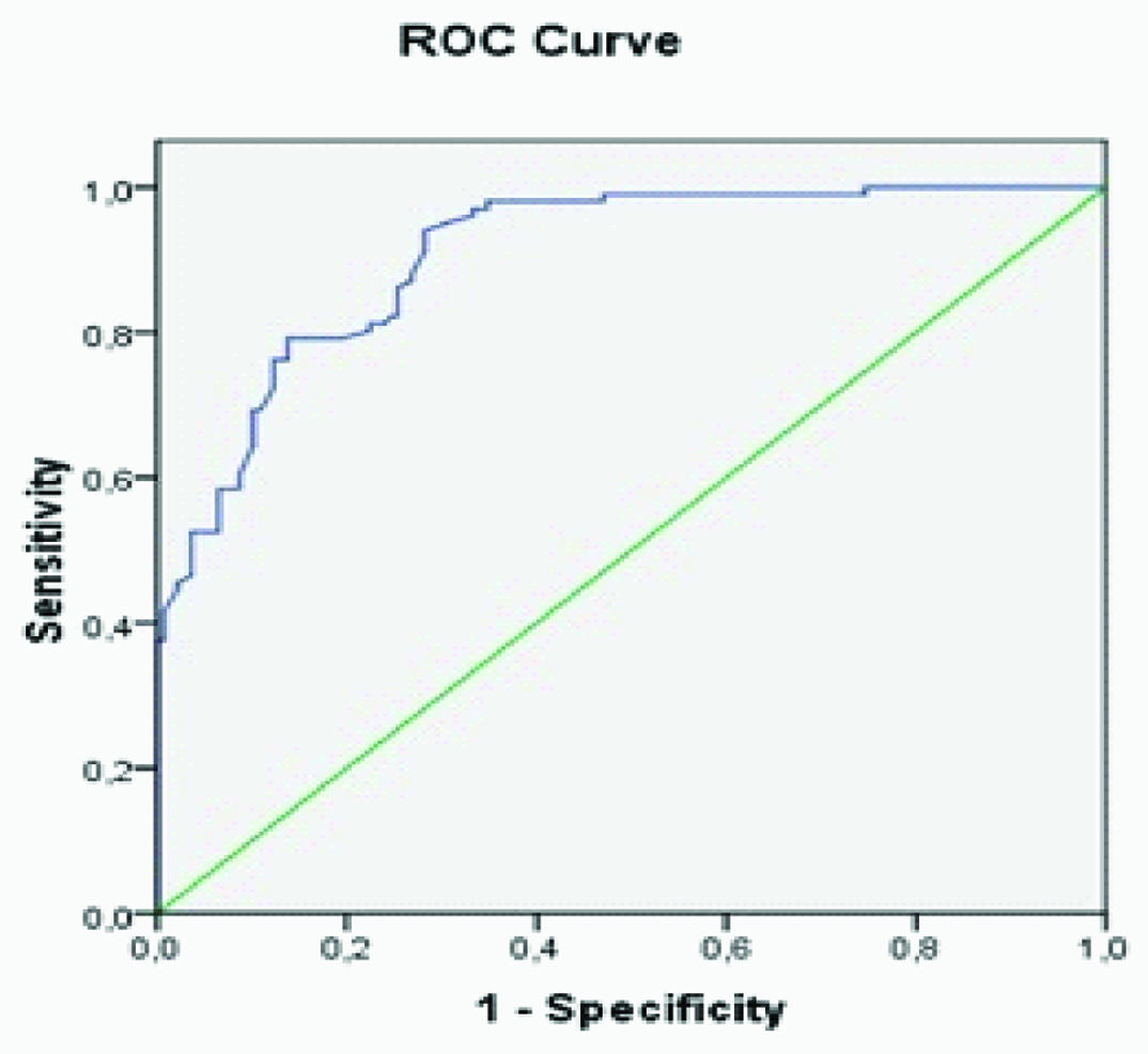 In the GDM group, there was a significant positive correlation between the MPV values and the HOMA-IR, and insulin levels (r=0.227, p=0.02; and r=0.206, p=0.03; respectively). Pearson’s correlation test showed a significant negatively correlation between the MPV values and Apgar 1 min and 5 min scores (r=-0.485, p<0.001; and r=-0.399, p<0.001, respectively). In the multivariate logistic regression analysis, the MPV value was most consistently associated with the Apgar 1 min score (β=-0.387, p=0.003). In the control group, we found a positive correlation between the MPV value and insulin levels, BMI and HOMA-IR values (r=0.193, p=0.02; r=0.329, p<0.001; and r=0.194, p=0.02 respectively). ROC analysis was performed to evaluate the ability of the MPV values at 24–28 weeks to diagnose GDM, as well as could be evaluated the appropriate cut-off value for our population in this study. The area under the ROC curve (AUC) for the MPV to diagnose GDM was 0.906 (p<0.001; 95%confidence interval {CI}, 0.871–0.942). An MPV of >8.0 fL had a sensitivity of 82% and a specificity of 75% for the prediction of GDM [Table/Fig-2].