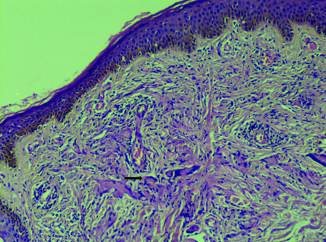 According to O’Brien’s actinic hypothesis, solar damage to the elastic fibres is the initial event in pathogenesis, which provides an antigenic trigger for a CD4 mediated immune granulomatous reaction [1,8,9]. Due to reports of lesions on covered areas of the skin and no definite proof of role of sunlight in its causation, some authors preferred the descriptive term giant cell elastolytic granuloma over actinic granuloma [10]. However, the actinic hypothesis was further strengthened by finding of lesions in affected skin of vitiligo patients [11].