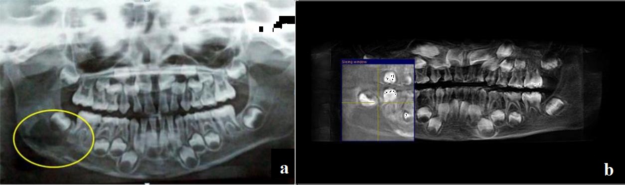 (a) Orthopantomogram; (b) Cone beam CT – showing the lesion on the right side mandible.