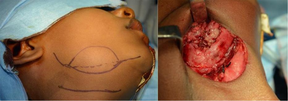 A five-year-old child patient came with a chief complaint of intermittent pain on the lower right side of the face since one month duration. Swelling was small in size and gradually increased to present size. On extra-oral examination, a localized swelling measuring approximately 4x5cm extending anteriorly from the right commissure of the lip up to the angle of mandible. Inferiorly up to the lower border of the mandible [Table/Fig-1]. Lymph node examination revealed two palpable submandibular lymph nodes on the right side which were mobile and tender on palpation. Intra-oral examination presented with restricted mouth opening with inter-incisal opening of 1.5cm and an ovoid solitary swelling in relation to the right buccal sulcus in relation to 43 to an erupting 47 extending till the retro-molar trigone which was tender on palpation [Table/Fig-2]. On bimanual palpation, expansion of the buccal and lingual plate was present. Orthopantomogram (OPG) and Cone Beam Computerized Tomogram (CBCT) revealed an ill-defined radiolucency from the mesial root of 46 to the ascending ramus with expansion of the lower border of the mandible [Table/Fig-3]. To diagnose the involvement of other systems in this triad a diagnostic 99 TC-MDP whole body scintigraphy was performed. The scintigraphy showed an increase tracer pooling in the right side of the mandible with no evidence of bony metastasis at other sites of the body [Table/Fig-4]. An incisional biopsy was deferred as the patient was uncooperative to local anaesthetic procedure. Patient was taken up for localized lesion enucleation, bone curettage and extraction of the tooth germ (46 and 47) with excision of the right submandibular lymph node. Under general anaesthesia, right Risdon’s submandibular incision was placed and layer by layer dissection was performed to reach the submandibular region [Table/Fig-5]. The submandibular lymph node was removed. Facial artery was ligated and the lower border of the mandible was reached. The lesion was identified and enucleated. Peripheral ostectomy was done for the adjacent bone along with removal of 47 tooth follicle [Table/Fig-6]. Haemostasis was obtained. The curetted specimen was sent for histopathological analysis which was suggestive of solitary eosinophilic granuloma [Table/Fig-7a]. For confirmatory diagnosis, an immunohistochemistry was performed which showed CD 1A immunoreactive in the tumour cells correlating with Langerhans Cell Histiocytosis (LCH) [Table/Fig-7b]. Post-operatively, patient was treated with the Tablet Indomethacin 300 mg BD regimen for a period of 2 months. Radiotherapy was deferred due refusal of the parents. He was periodically observed for a year and showed no evidence of recurrence till date. A one year post-operative OPG showed good wound healing with no signs of recurrence of the lesion [Table/Fig-8].