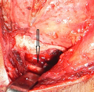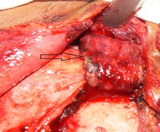 Surgical Procedure: All patients were operated under general anesthesia after written informed consent. Classical pre-auricular and Al-Kayat and Bramely’s modified pre-auricular incision were made as indicated to gain access to TMJ region of involved side [Table/Fig-3] [2,3]. Layer by layer dissection was carried out until superficial temporal fascia was reached. Superficial temporal fascia dissected out and retracted anteriorly to avoid injury to facial nerve. Periosteum over zygomatic arch was dissected and care was taken to avoid injury to superficial temporal artery and vein too. Ankylotic mass was exposed and belligerent excision of bony mass was carried out by chisel and bur with the gap of at least 10-15 mm between the floor of the glenoid fossa and the mandible [Table/Fig-4,5]. The glenoid fossa was recontured and shaped as necessary. Following excision of the bony mass the MMO of 30-35mm was achieved passively. In accordance with the protocol for TMJ ankylosis (1990, 2009) [4,5] contralateral coronoidectomy was performed in 4 cases through intra-oral approach when mouth opening was less than 35mm intra-operatively. Finger shaped composite temporal myofascial flap (includes temporalis muscle and fascia).