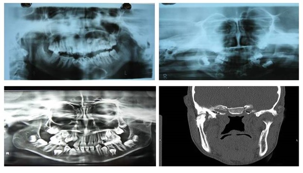 Total 10 patients with Temporomandibular Joint (TMJ) ankylosis reporting to the outpatient department of Oral and Maxillofacial Surgery, Maharaja Ganga Singh Dental College and Research Centre, Sri ganganagar, Rajasthan, India were included irrespective of age, sex, caste and socioeconomical status. Diagnosis of TMJ ankylosis was based on the basis of clinical assessment as Maximum inter-incisal Mouth Opening (MMO) [Table/Fig-1] and other cardinal signs of ankylosis [1] followed by radiographic assessment using Postero-anterior (PA) mandible view, Orthopantomogram (OPG), lateral oblique view and CT scan which showed various degrees of condylar involvement with condyles varying from normal size to a large spherical mass involving the condylar process as well as the coronoid process [Table/Fig-2].