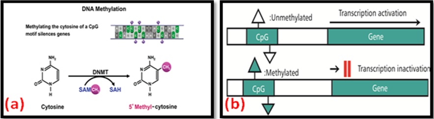 DNA Methylation: Within the nucleus, chromosomal DNA is tightly associated with proteins, and these interactions form the ordered structure known as chromatin. The methylation takes place in Cytosine-phosphate-Guanine (CpG) dinucleotides of the DNA chain with the covalent transfer of a methyl group from S-Adenosyl Methionine (SAM) to cytosine [Table/Fig-2a] [8]. CpG sequences tend to be germline-specific or associated with imprinted genes, and the methylated DNA sequence in CpG sites cause the more condensed DNA structure. This process leads to transcriptional repression and gene silencing [Table/Fig-2b] [9].