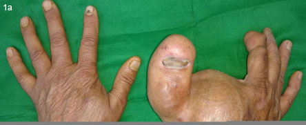 A 65-year-old male recently came to us for his very insidiously enlarging right hand. As per his history, the swelling was first noticed by him approximately fifteen years ago. Patient, a farmer by occupation had no problems working in field and hence chose not to seek any medical consultation till now. The swelling increased gradually to present size over a decade. During this period there were no neurological symptoms (related to nerve compression).