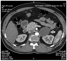 A 43 years old male, not a diabetic or hypertensive presented with history of intermittent colicky abdominal pain lasting 5-10 minutes with 1-2 episodes/month for the past one and half years . During those episodes, he was found to have high blood pressure. For the last two months, these episodes of abdominal pain were associated with sweating, palpitation and syncope. He denied any history of breathing difficulty, loss of weight, loss of appetite or back pain. He was not a smoker or alcoholic. There was no history of any long term medications intake. He had one episode of pulmonary edema and high blood pressure prior to admission in our hospital. He was treated for pulmonary edema and high blood pressure. He was referred here for further workup.