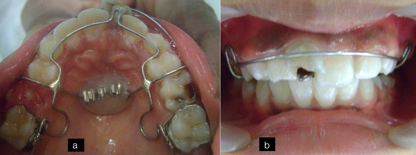 The system has been developed by Myofunctional Research Co. (MRC), Queensland, Australia, as a simpler method for expansion of arches. It produces better stability with simultaneous correction of habit. An advantage of this system is that it does not involve using acrylic in the palatal vault which allows the free movement of the tongue [8]. There is a controversy regarding the ideal time for performing the expansion. Sari Z et al., reported that rapid maxillary expansion by means of fixed screws (e.g., Hyrax) produces better results when it is performed in the early permanent dentition [8]. Although this statement is supported by other authors [9–11], but it can also be successfully done in adults [12–14]. Nevertheless, maxillary and mandibular expansion rises up as one of the important phase of orthodontic treatment producing arch perimeter increase, and so, avoiding extraction of teeth [15]. In this case, space was needed for the alignment of displaced incisor, instead of making the child wait till the eruption of all permanent teeth and subject the patient to fixed orthodontic treatment. We decided to align the teeth in the arch using this novel approach.
