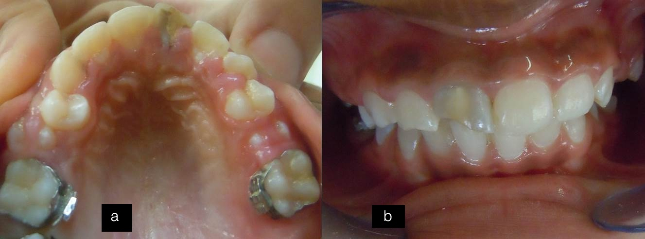 After five months follow-up (a) Maxillary arch view showing well aligned of the incisors; (b) Frontal view of the anterior teeth.
