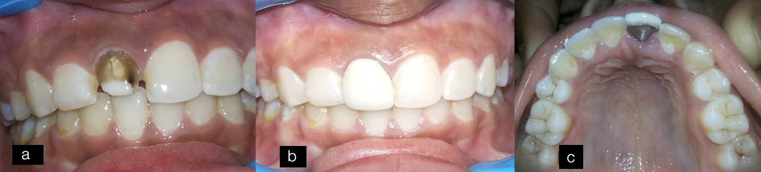 Follow-up: After five months, the maxillary central incisors were aligned into proper position in the arch [Table/Fig-6a,b]. The positions of the teeth were retained with the help of Hawley’s appliance for one year. After one year of retention, the aesthetic rehabilitation of the tooth was planned. Crown preparation was done following which polycarbonate crown was cemented and patient was recalled every six months, but patient reported with repeated failure of the temporary crowns, following which the placement of Porcelain Fused to Metal (PFM) crown was decided as tooth was already non-vital and root canal treated. PFM crown was fabricated, cemented [Table/Fig-7a-c] and radiographic assessment was done by IOPAR [Table/Fig-8]. Composite restoration was done in tooth #12 which exhibited Ellis Class I fracture. The patient was happy and satisfied with functional and aesthetic rehabilitation.