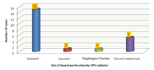 Limitations of this review are that the number of the cases was limited and various authors have used different ways for managing the case of peroral extrusion of VPS catheter following VPS placement. As defined guidelines for management of such cases is lacking, I believe that authors have managed their cases based on their personal experience in dealing with other VPS related complications. The exact cause and mechanism for stomach being the commonest site for entry by peritoneal part of VPS catheter is not known. In n=5 (22.7%) of the reviewed cases the entry site in bowel by peritoneal part of VPS catheter was not known. Cases of peroral extrusion of VPS catheter following VPS placement, published/available in language other than English, were not included in this review, except one.