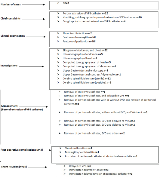 Twenty-two published manuscripts (n) were available on the topic relating to peroral extrusion of VPS catheter. All were cases and were included for the review. This review included n=10; 45.45% male and n=12; 54.54% female. All of them were reported in children below 12-year of the age, except two case reports in adult that occurred at the age of 27-year and 47-year, respectively. Overall, the mean age at the time of peroral extrusion of VPS catheter was 6.94 ± 10.87 years. The interval from VPS insertion or last shunt revision to the occurrence of peroral extrusion of VPS catheter ranged from 10-days to 10-year, with a mean of 20.31 ± 28.37 months. More than two-third (n=15; 68.18%) of the case occurred within one-year of VPS insertion/last shunt revision. Clinical diagnosis was obvious in all the cases due to peroral extrusion of VPS catheter. The site of perforation by the VPS catheter was stomach in 15, jejunum in 1, diaphragm/trachea in 1, while the site of bowel perforation was not mentioned in 5 cases. Surgical procedures opted by authors in order of frequency were: (a) removal of entire VPS catheter n=5; (b) removal of entire VPS catheter, and delayed re-VPS n=5; (c) removal of peritoneal catheter with or without External Ventricular Drainage (EVD), and revision of peritoneal catheter n=3; (d) removal of peritoneal catheter, with or without EVD, and VA shunt n=3; (e) removal of peritoneal catheter, EVD and delayed re-VPS n=2; (f) removal of entire VPS catheter, EVD and delayed re-VPS n=2; (g) removal of peritoneal catheter, EVD and others n=2. Two deaths are also reported during the management of peroral extrusion of VPS catheter.