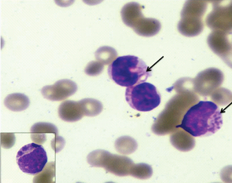 Wright stained peripheral smear showing blasts with pseudo-Chediak-Higashi granules (×400). Inset showing higher magnification of single blast (×1000).