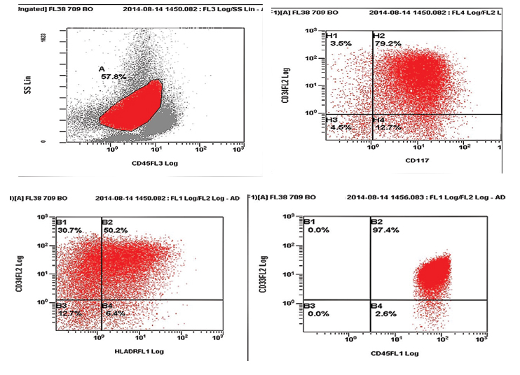 On flow cytometry, gated blasts revealed positivity for CD34, CD117, HLA DR and CD33.
