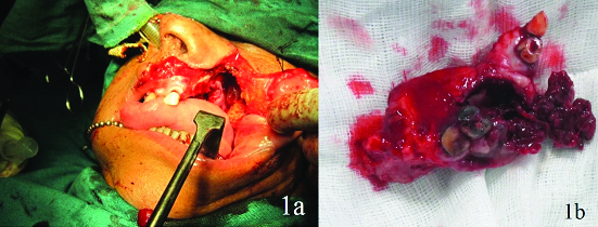 A 72-year-old female patient reported to the Department of Oral and Maxillofacial Surgery, with a chief complaint of growth over the upper left back tooth region since one month. She noticed the growth as a small mass that progressively enlarged in size and it was associated with pain from the past one week. The pain was intermittent, moderate in intensity and relieved by analgesics. On examination, there was no obvious facial swelling. Intraoral examination revealed a swelling of 4x3 cm in diameter soft in consistency with irregular edges around maxillary left second and third molars covering up to the middle thirds of crown of these teeth. The growth showed red and white areas and was tender on percussion. The patient was advised for routine blood investigation and Computed Tomography (CT) scan. CT report showed a lesion with greatest dimension of 7x5 cm involving the left posterior maxilla and maxillary sinus with ill-defined granular bone periphery. Internally the lesion showed evidence of large hypodense and hyperdense areas with thin trabecular pattern and thin separations within the lesion. Roots of second molars showed areas of resorption. The medial, superior and posterior lateral walls of the left maxillary sinus were intact. An incisional biopsy was taken from the first molar region and was sent for histopathological examination. The microscopic examination showed parakeratinized stratified squamous epithelium which appeared hyperplastic and underlying connective tissue showed dense chronic inflammatory cell infiltrate, chiefly lymphocytes. The deeper connective tissue showed dispersed multinuclear giant cells in association with vesiculated mononuclear cells with moderate vascularity. The histopathological report confirmed the mass as central giant cell granuloma. A subtotal maxillectomy was planned for the patient. Written informed consent was obtained from the patient. Patient was prepared and draped under orotracheal intubation. Weber Ferguson incision was made through the skin and subcutaneous tissue. Upper lip was divided through its full thickness upto gingival labial sulcus and incision was extended sublabially along the mucobuccal fold upto the tuberosity. The subciliary component was extended preseptally. A subperiosteal cheek flap was then elevated from the maxilla. The maxilla was fully exposed and a subtotal maxillectomy was performed removing the tumour in toto [Table/Fig-1]. As the primary closure of the defect couldn’t be made during the surgery, a preoperatively fabricated obturator was placed and stabilized to the cheek flap using 3-0 ethilon suture. Postoperative period of the patient was uneventful. Patient was kept under observation for one year.