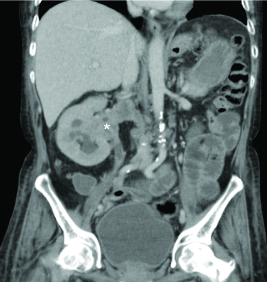 Coronal section of contrast enhanced computed tomography (CECT) of the abdomen showing a heterogeneously hypo-enhancing soft tissue lesion at the pelvis of right kidney (*) extending into the right ureter, calyces, right renal vein and inferior vena cava.
