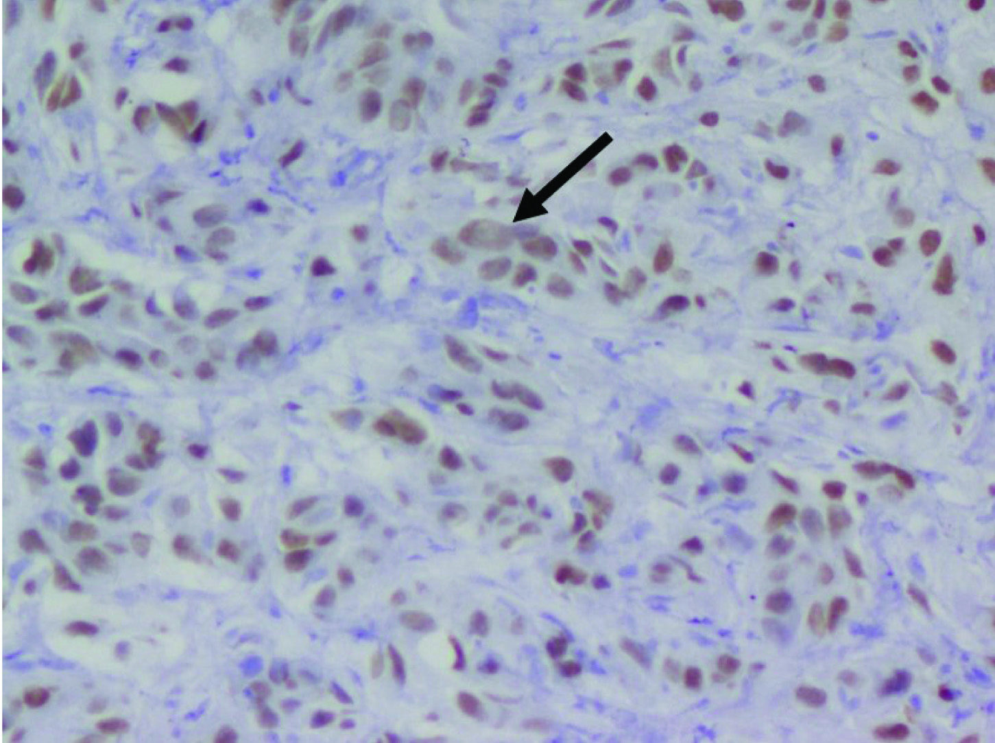 Tumor cells showing intense nuclearpositivity for PAX8 (thick arrow) with desmoplastic stroma (Magnification 40X; PAX8).