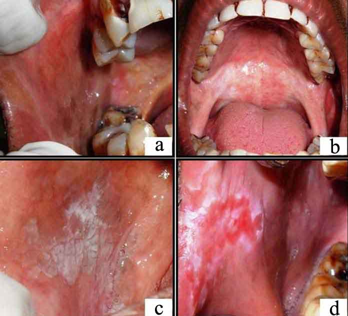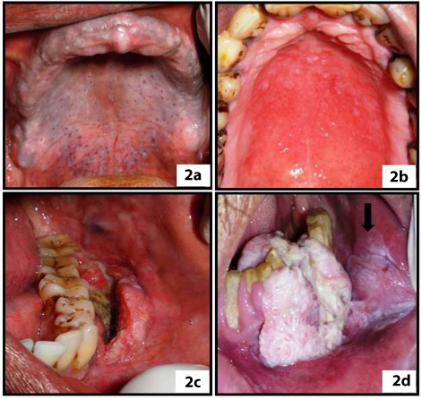 (a) Shows blanching and presence of fibrous bands in right buccal mucosa; (b) Shows blanching of soft palate; (c) Shows homogenous oral leukoplakia on right buccal mucosa; (d) Shows non-homogenous oral leukoplakia on right commissure and buccal mucosa.