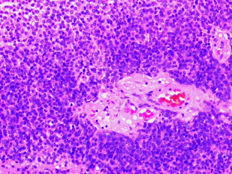 Photomicrograph shows tumour cells in sheets with round hyperchromatic nuclei and moderate amount of eosinophilic cytoplasm. (H&E, x200);