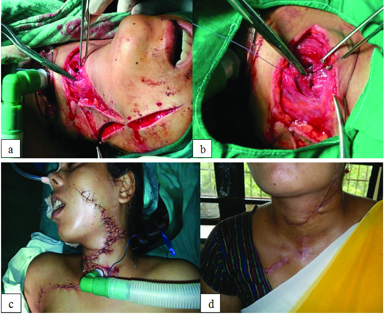 A 24-year-old female presented to the casualty with alleged history of assault by using knife on neck five hours earlier. Informant was the father. Multiple lacerations over neck and face, shoulder were present, out of which the largest wound was on neck extending from right sternocleidomastoid to left sternocleidomastoid horizontally and obliquely towards the left angle of mandible measuring approximately 15×3 cm [Table/Fig-1a]. Trachea was exposed and air leak was present through the defect [Table/Fig-1a]. There was no free bleeding, no swelling over neck and no obvious cervical spine injury. Patient was immediately shifted to operation room, airway secured by doing low tracheostomy below the defect. Then on exploration of the neck wound, all major vessels of the neck were found to be intact. Thorough saline wash was given and then debridement of wound with primary closure was done. A defect over anterior trachea found, was closed primarily using 3-0 vicryl [Table/Fig-1b] and then the neck wound was closed in layers, skin was sutured using 3-0 Ethilon [Table/Fig-1c]. Nasogastric tube was inserted and patient was put on antibiotic treatment. On day 14th sutures were removed and tracheostomy tube was changed to Fullers tracheostomy tube no.30, patient was able to talk afterwards. Nasogastric tube was removed on 21st day. Patient was discharged after that and follow up was done after one week [Table/Fig-1d].