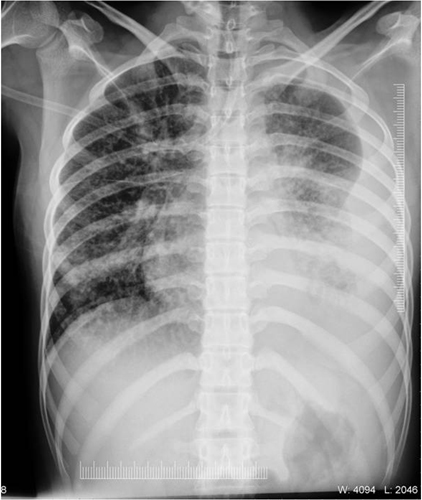 Chest X-ray showing bilateral patchy infiltrates with a left sided pleural effusion.