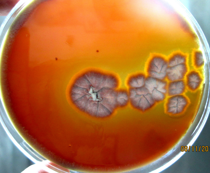 Phospholipase activity on egg yolk medium – a clear halo zone of clearance around the colony indicated phospholipase production;