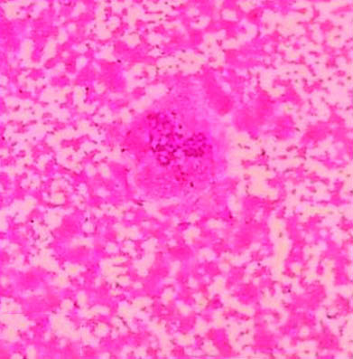 Aspirate smear of the swelling showing large areas of haemorrhage with a small cluster of round to oval cells with indistinct cell borders (H&E stain, 40 x);