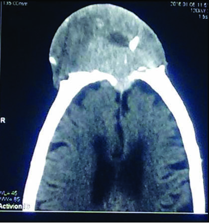 Computed Tomography (CT) of the brain showed a well-defined heterogenous soft tissue density lesion in the midline located mainly in the pre frontal region with internal calcification. The underlying lesion showed erosion and destruction of the bone with intracranial extension. The lesion was limited by the duramater and measured 9x6.5 cm, extending upto the frontal sinus and nasion [Table/Fig-3]. Skin over the lesion appeared stretched.