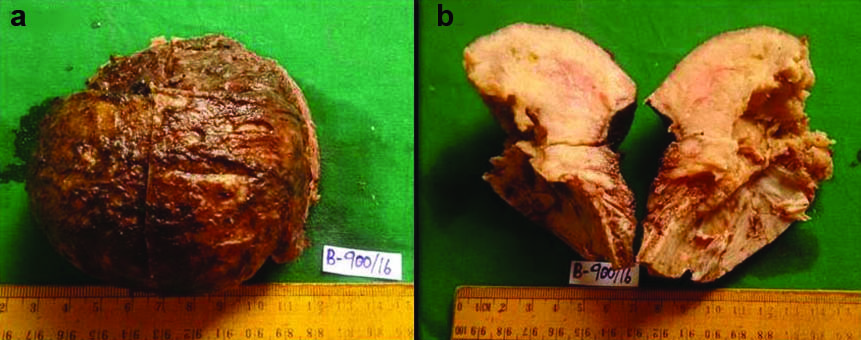 (a) Surgically resected tumour mass with underlying attached portion of frontal bone; (b) Cut section of the excised mass showing a fleshy grey white tumour, extending into the bony margins.