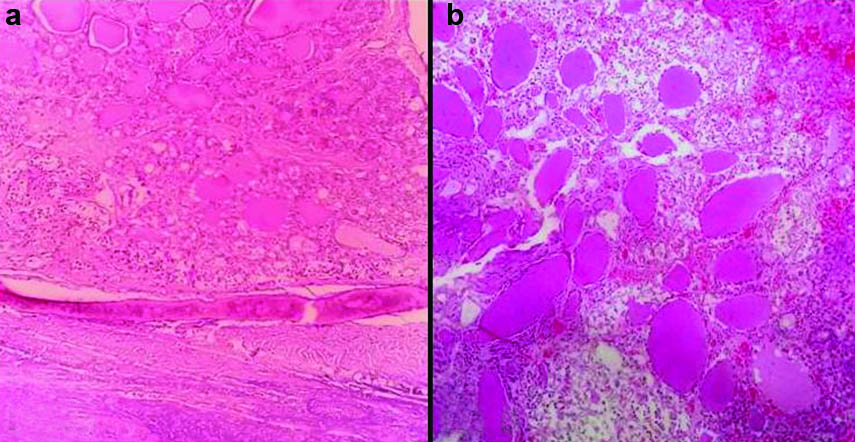 (a) Microphotograph showing a neoplasm comprising of microfollicles, with extension into the bony trabeculae. (H&E, 100X); (b) Microphotograph showing varying sized micro and macro follicles, with colloid. (H&E, 100X).