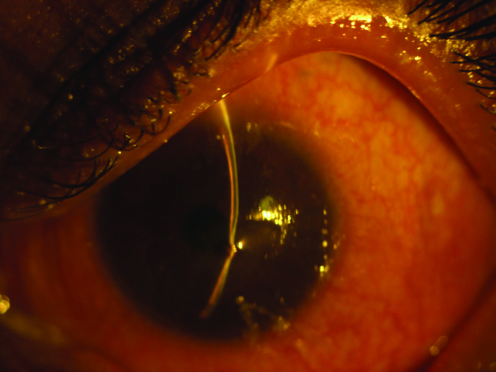 Showing self sealed corneal perforation in inferonasal quadrant.