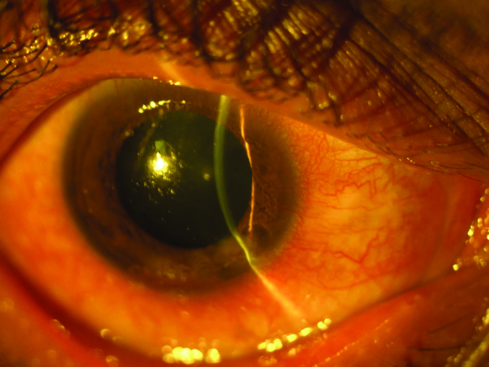 Left eye on slit illumination showing flat anterior chamber.