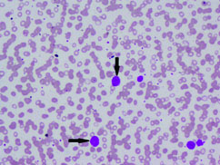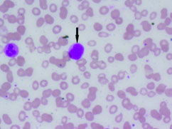 Abnormal cells in peripheral smear (arrow) (Leishman stain; 10X).