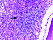 Abnormal cells in bone marrow (arrow) (H&E; 10X).