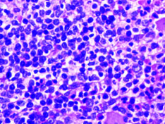 Inguinal lymph node biopsy was done. Grossly four lymph nodes were identified which on microscopy showed diffuse effacement of nodal architecture with sheets of medium sized lymphoid cells with scant cytoplasm, pleomorphic round to oval nuclei, irregular nuclear contours, condensed nuclear chromatin, inconspicuous nucleoli and mitosis (<10/10HPF) along with interspersed high endothelial venules and congested thick walled blood vessels.