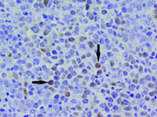 Cyclin D1 positive in the abnormal cells (40X).